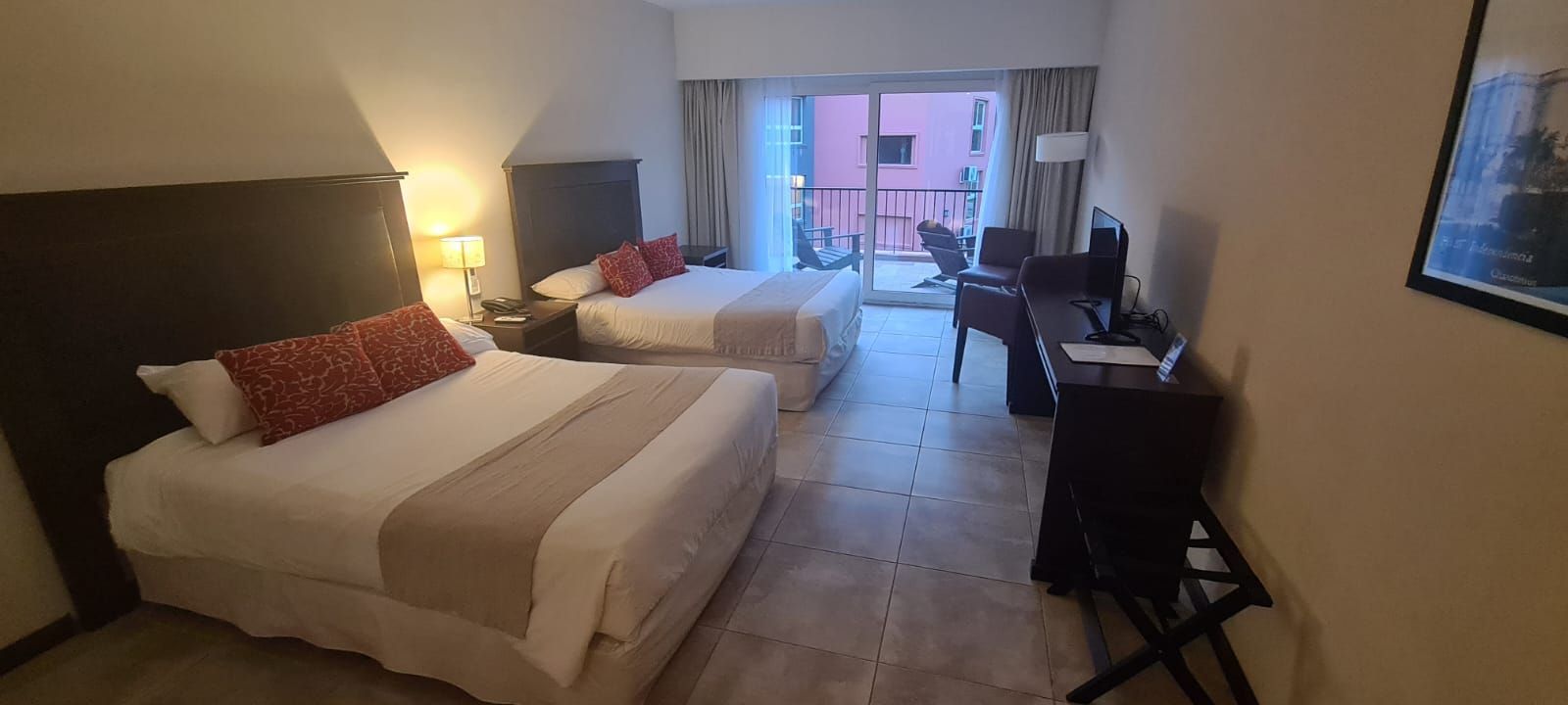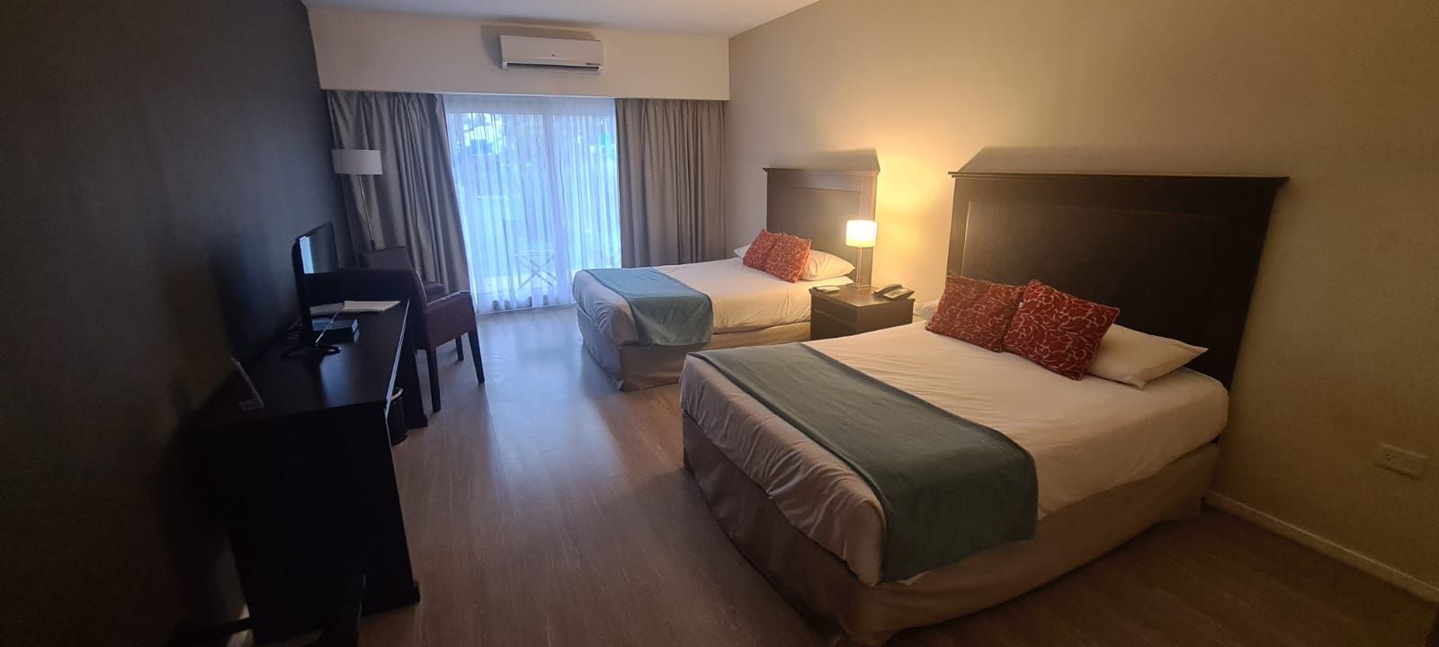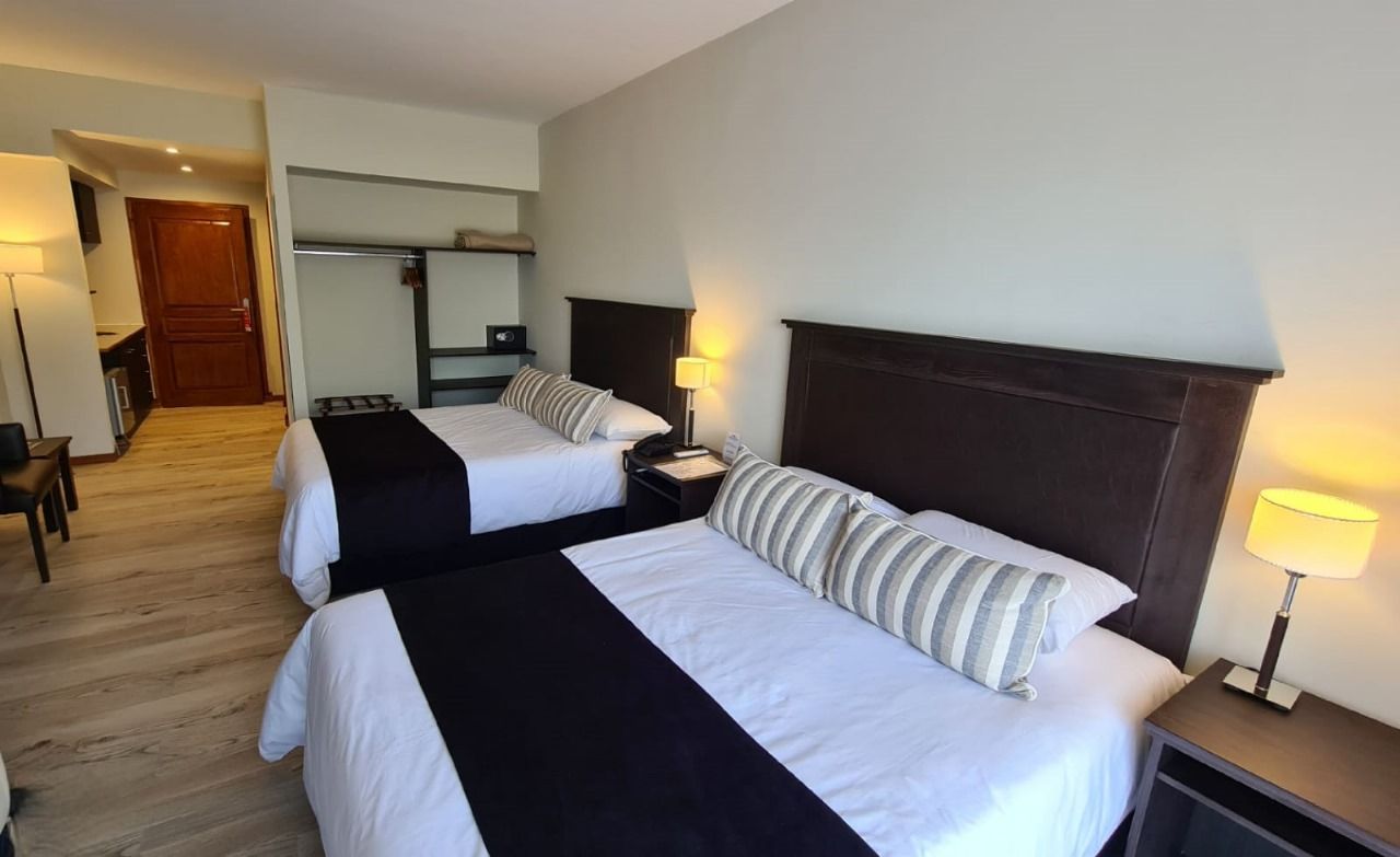 Habitaciones amplias, cómodas y aireadas de 32 mts2 con dos camas Queen matrimoniales de 1,40 x 2 mts más puerta ventana corrediza. Cuenta con split 2250 frigorías frío/calor, TV 32”, mobiliario y blanquería de excelente calidad. Sillones, escritorio, teléfono, frigobar, caja de seguridad, placard, baño completo, secador de pelo y amenities.