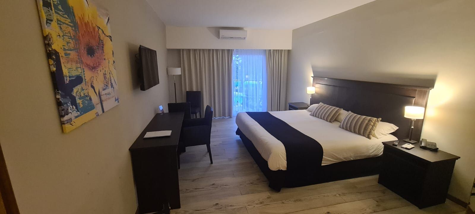 Habitaciones amplias, cómodas y aireadas de 32 mts2 con una cama King matrimonial de 2 x 2 mts más puerta ventana corrediza. Cuenta con split 2250 frigorías frío/calor, TV 32”, mobiliario y blanquería de excelente calidad. Sillones, escritorio, teléfono, frigobar, caja de seguridad, placard, baño completo, secador de pelo y amenities.