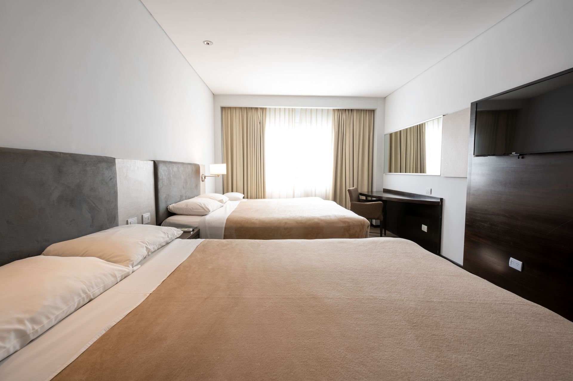 Habitación con 2 camas matrimoniales o una cama matrimonial y 2 camas extras o una cama matrimonial grande (dependiendo la cantidad de personas que sean y del mobiliario del hotel), frigo bar, caja de seguridad, aire acondicionado frío/calor, televisión led.